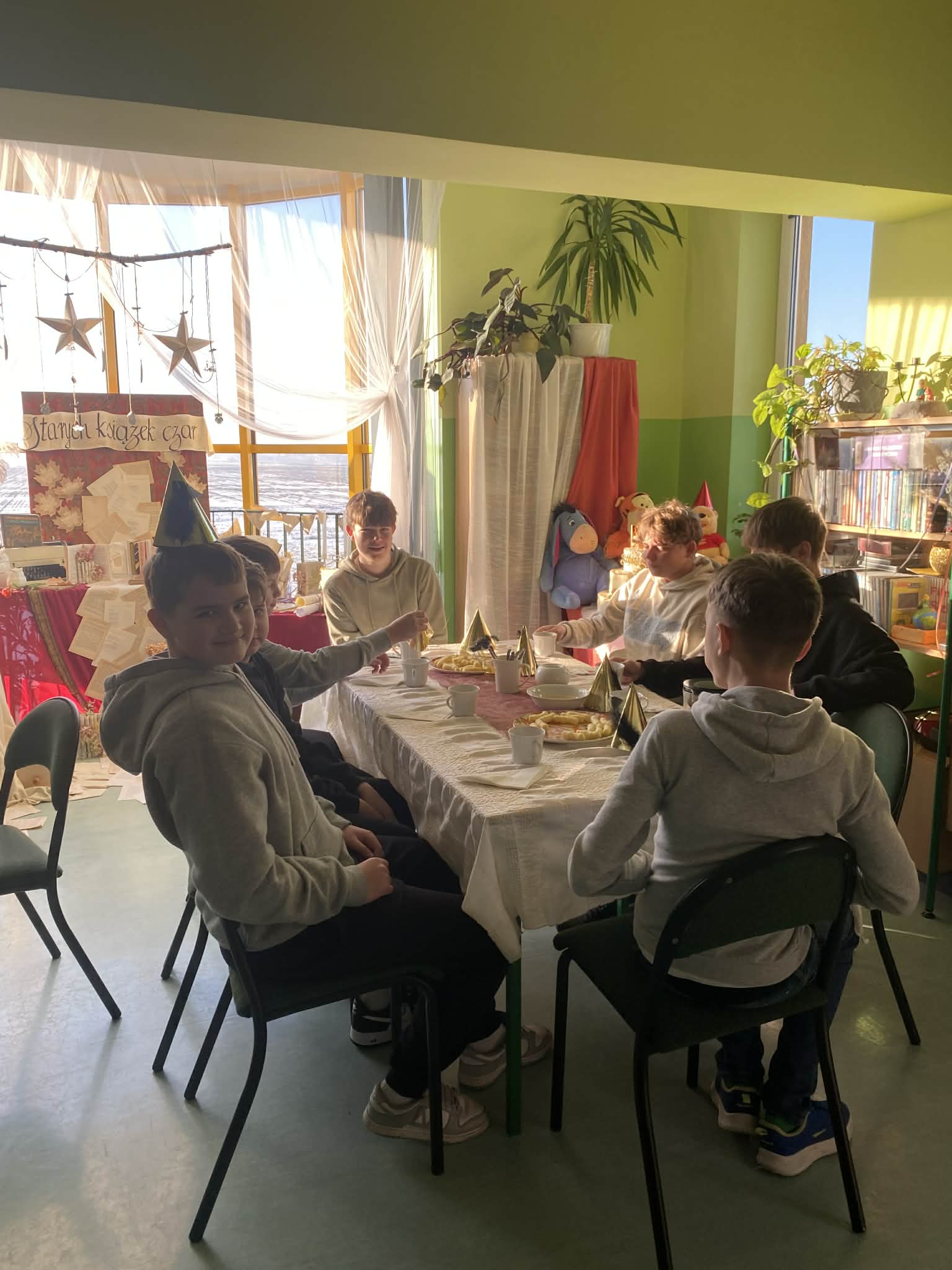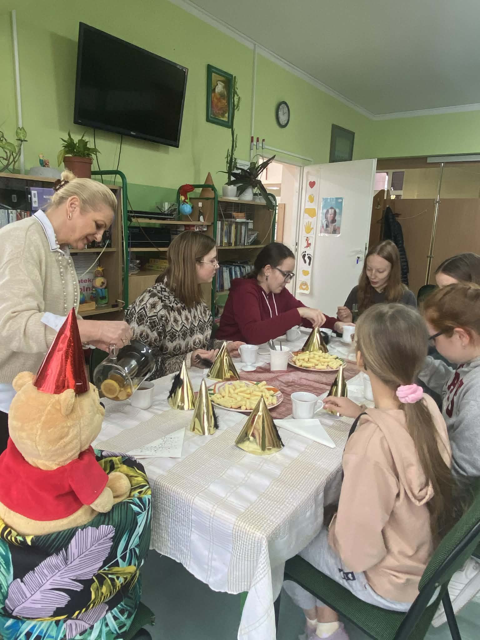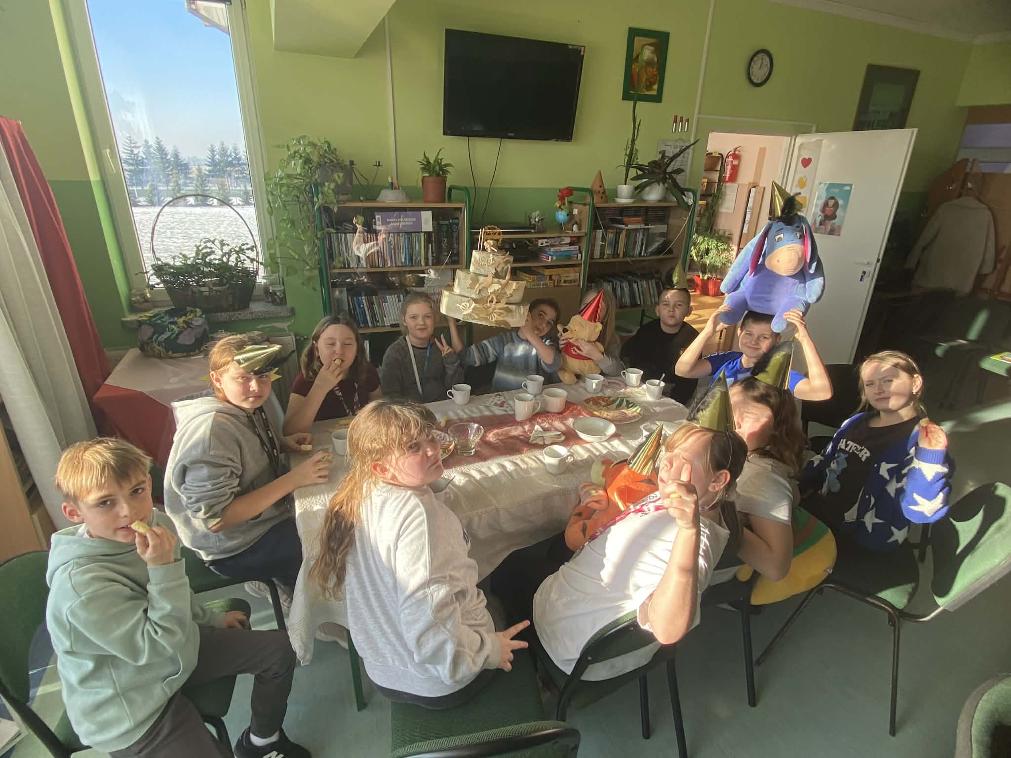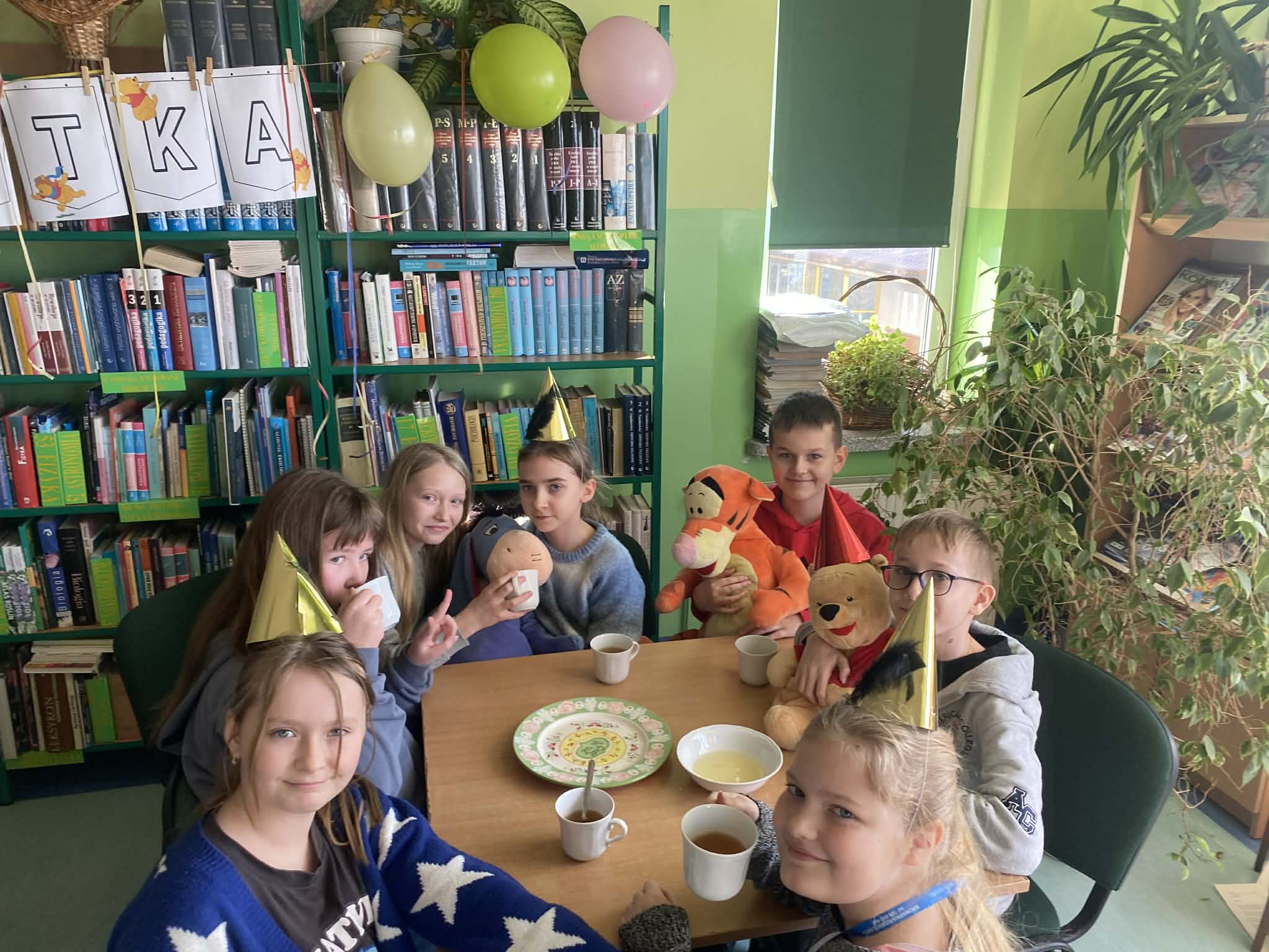 16 i 19 stycznia 2026 roku biblioteka szkolna zaprosiła uczniów klas 4–8 na wyjątkową herbatkę urodzinową w towarzystwie Kubusia Puchatka i jego przyjaciół ze Stumilowego Lasu. W trakcie spotkania uczniowie mieli okazję przenieść się w świat znanej i lubianej książki A. A. Milne’a, by wspólnie świętować urodziny najpopularniejszego misia w literaturze dziecięcej, który w tym roku kończył 100 lat! Wydarzenie miało na celu nie tylko przypomnienie klasycznej lektury, ale także pokazanie, że ta znana i lubiana opowieść wciąż jest aktualna i wartościowa również dla starszych czytelników. Kubuś Puchatek to jedna z tych bajek, która przetrwała próbę czasu i do dziś bawi kolejne pokolenia. Bohater stworzony przez Alana Alexandra Milne’a ma nawet swoje święto – Winnie the Pooh Day – obchodzone 18 stycznia, w rocznicę urodzin pisarza. Dzień Kubusia Puchatka to tak naprawdę dzień każdego z nas: bo kto nie porównywał się kiedyś do mieszkańców Stumilowego Lasu? Jeden widział w sobie Kłapouchego, inny „był” Prosiaczkiem, a ktoś brykał beztrosko przez życie jak Tygrysek. To za pokazanie naszych cech, przywar i atutów pod urokliwym przebraniem kochamy opowieści o Kubusiu i jego przyjaciołach.