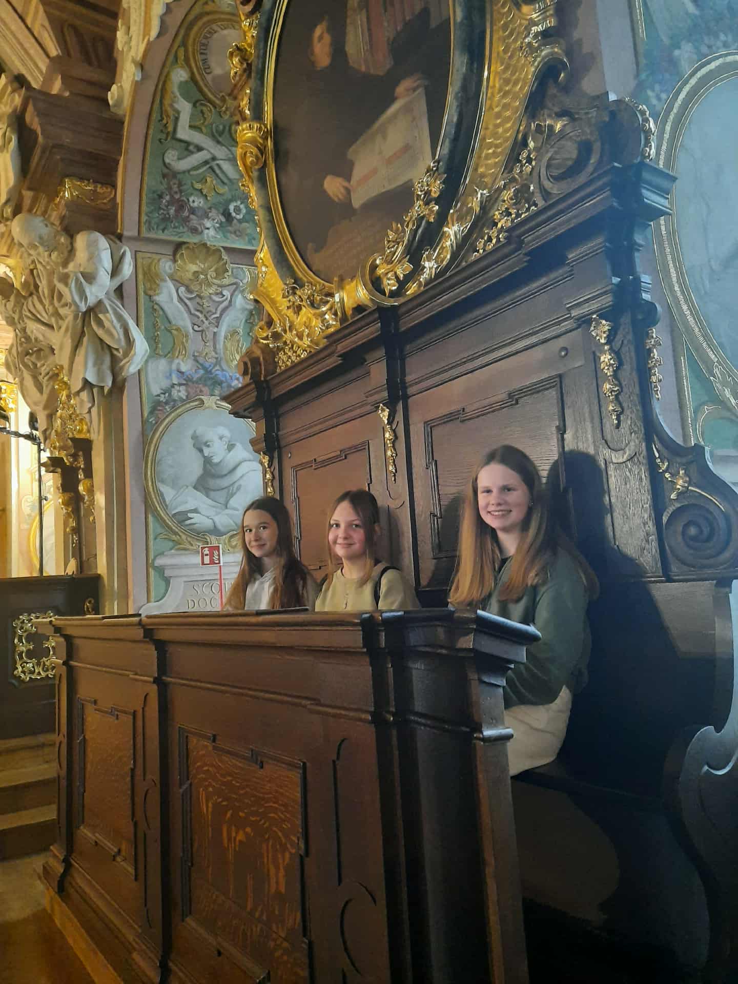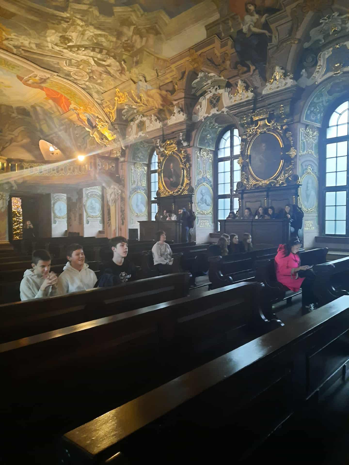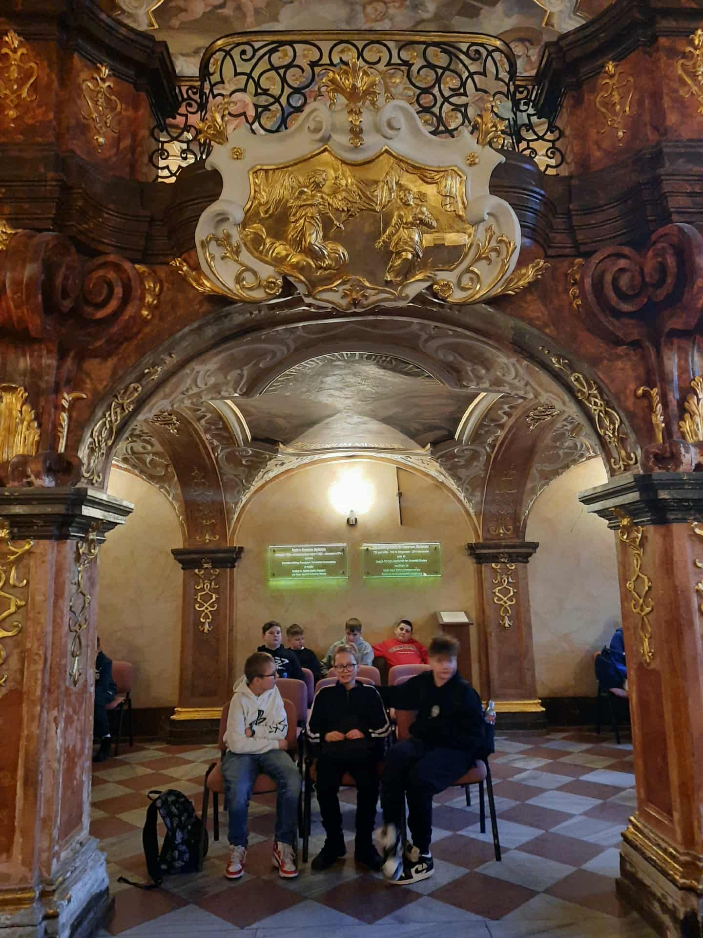 Następnie udaliśmy się do auli Leopoldina na Uniwersytecie Wrocławskim, słynącej z barokowego wystroju i bogatej historii. Freski w tym niezwykłym miejscu przedstawiają Apoteozę Mądrości Bożej, personifikację ówczesnych nauk i sztuk. Centralny fresk ukazuje Matkę Boską w opiece nad uniwersytetem. Całość uzupełniają wizerunki cesarzy, w tym Leopolda I, oraz portrety fundatorów i naukowców. W muzeum uniwersyteckim zwiedziliśmy również salę muzyczną- Oratorium Marianum. By podziwiać Wrocław z wysokiej perspektywy weszliśmy na taras widokowy.