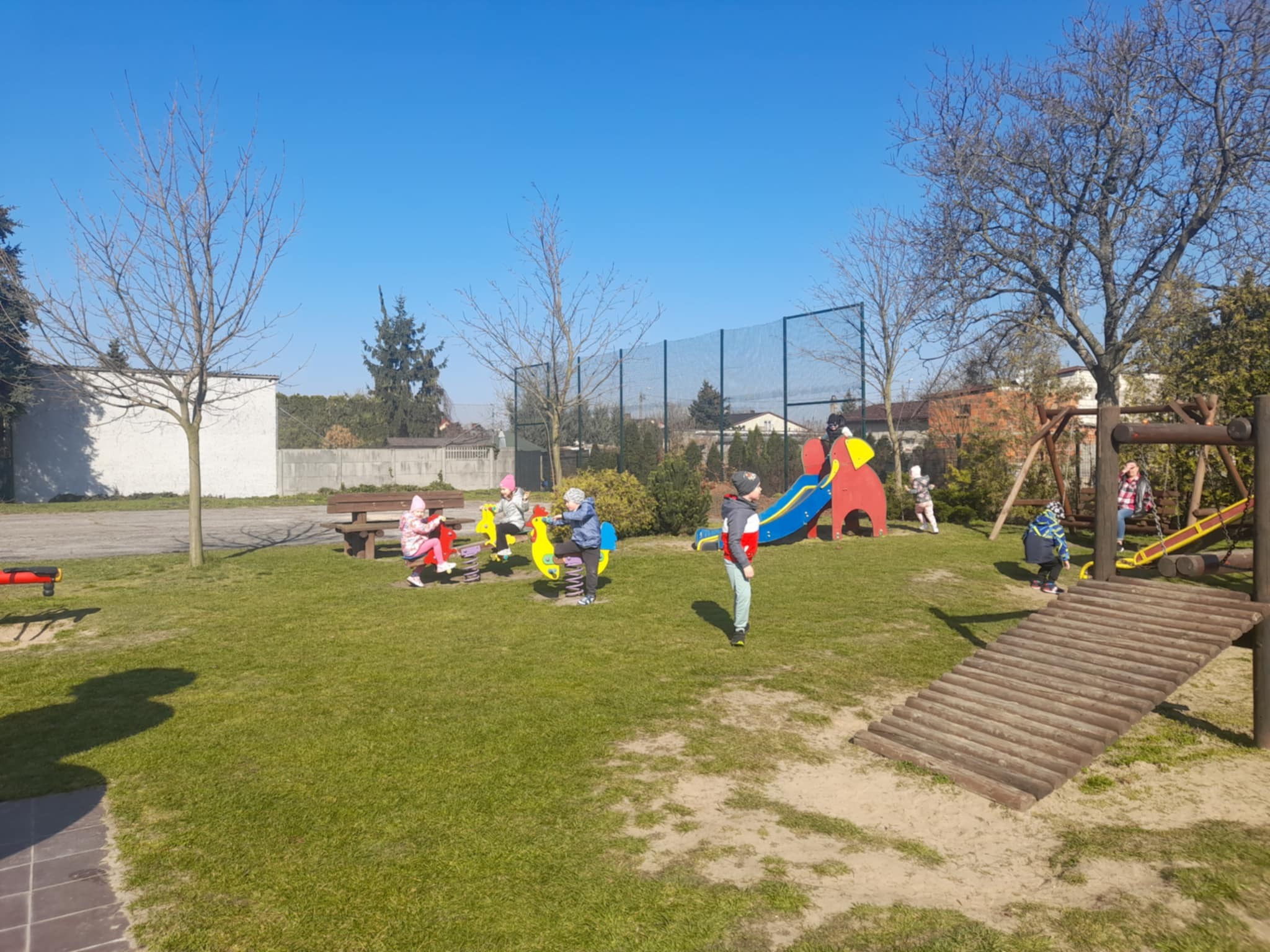 Wiosenne obserwacje przyrody i zabawy na placu zabaw w Żabkach, Pszczółkach i Sówkach