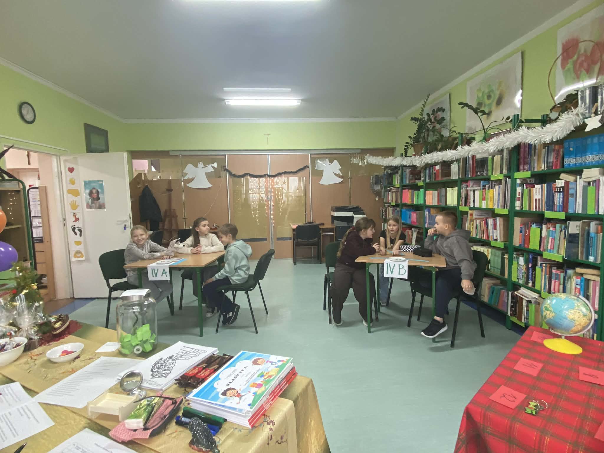 17 grudnia 2025 roku w bibliotece szkolnej odbył się konkurs dla klas czwartych pod hasłem „Witajcie w Akademii Pana Kleksa”. Konkurs miał na celu kształtowanie zainteresowań czytelniczych uczniów, doskonalenie czytania ze zrozumieniem, promowanie spontanicznej ekspresji plastycznej oraz promocję książek i biblioteki. Trzyosobowe zespoły zmierzyły się z siedmioma konkurencjami, które polegały między innymi na udzielaniu poprawnej odpowiedzi na pytania do tekstu, skojarzeniu rekwizytów z sytuacjami opisanymi w książce, dokończeniu zdań, pomalowaniu portretu Ambrożego Kleksa, odgadnięciu postaci na podstawie ich wypowiedzi i wiązaniu supełków na czas.