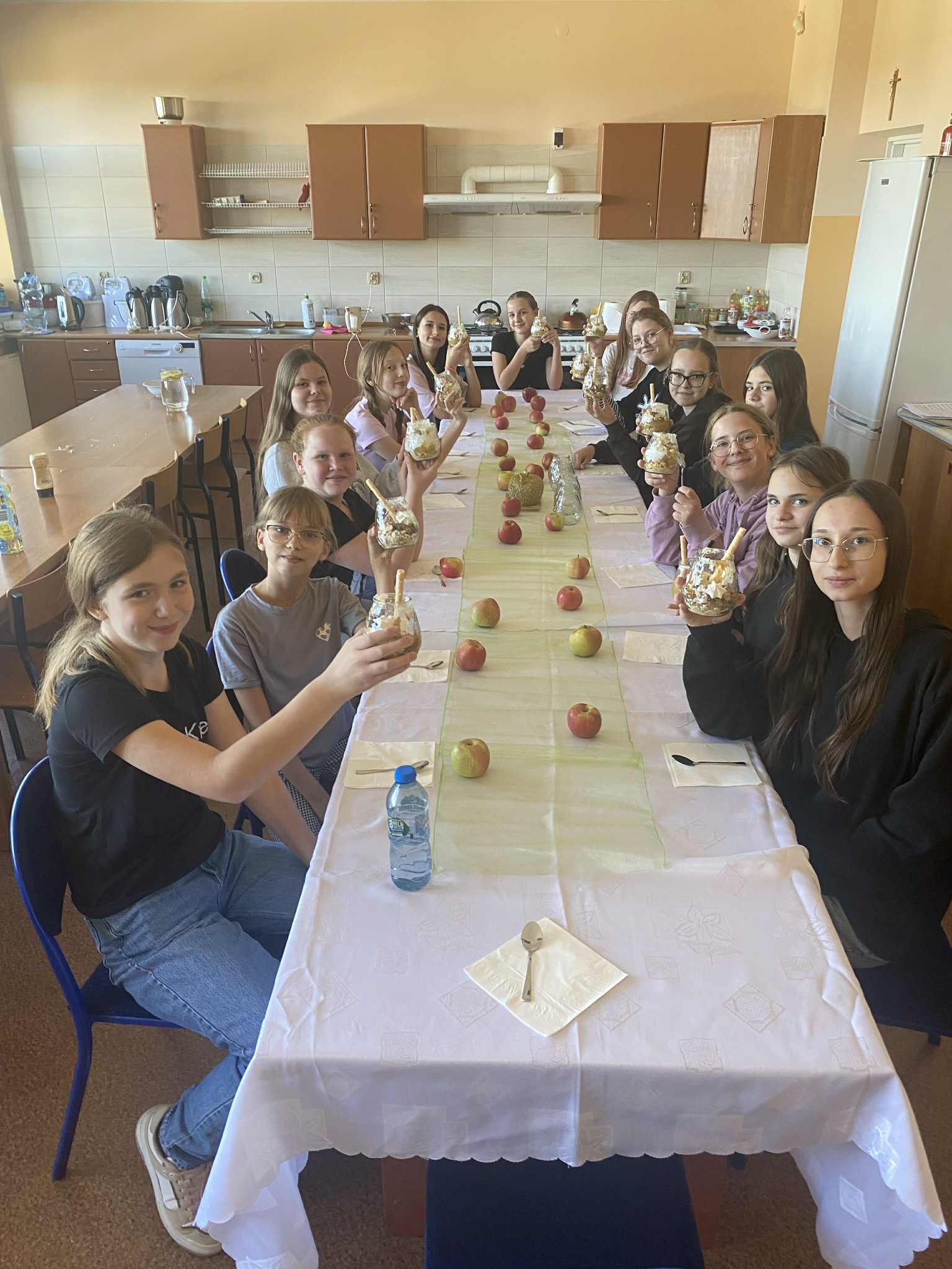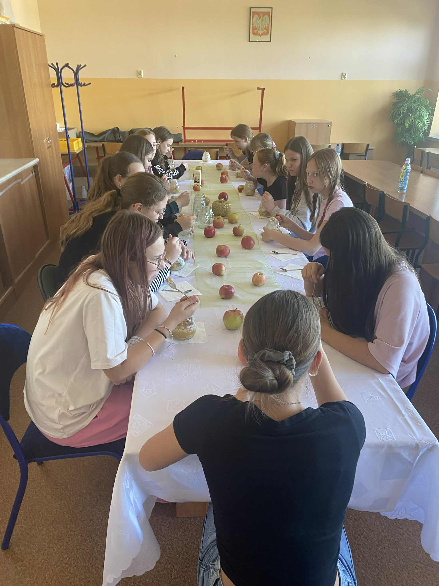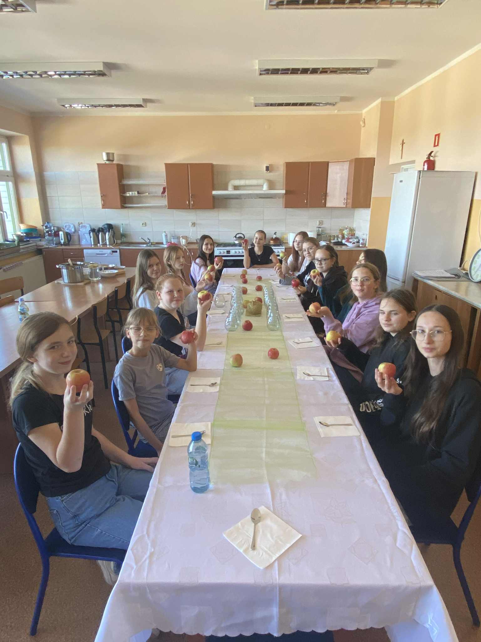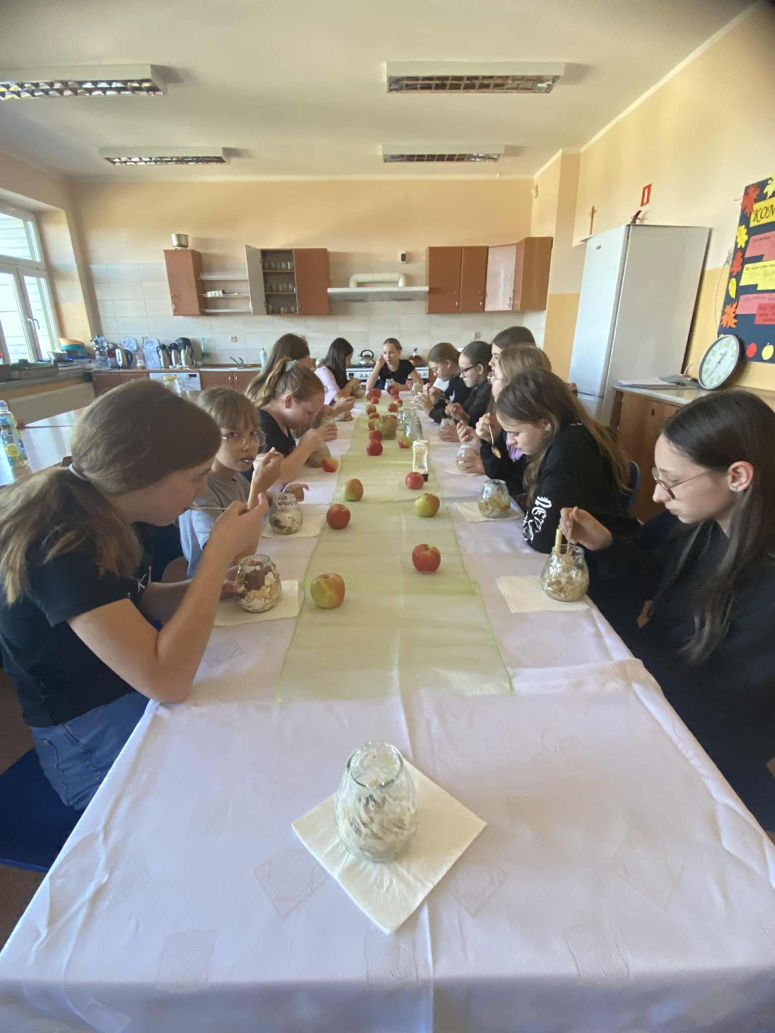 26 września 2025 r. na zajęciach Koła Miłośników Biblioteki po raz drugi obchodziliśmy Światowy Dzień Jabłka. Ten bardzo popularny owoc, bogaty w witaminy i wartości odżywcze, ma swoje święto, które jest kultywowane na całym świecie, również w naszej szkole. Celem zorganizowanego spotkania było zachęcenie uczniów do spożywania jabłek, jako źródła witamin oraz wyrabianie nawyku zdrowego odżywiania. Tego dnia nie jedno, ale wiele jabłek towarzyszyło nam podczas zajęć. Oprócz zajadania się zdrowymi, soczystymi jabłuszkami nawiązywaliśmy pozytywne relacje i świetnie się bawiliśmy. Przygotowany pyszny deser z prażonych jabłek, kajmaku, bitej śmietany, herbatników i czekolady zniknął błyskawicznie. Zajęcia minęły w „smakowitej” atmosferze i dostarczyły miłych wrażeń oraz mnóstwo witamin. Niech moc jabłek będzie z nami – przez cały jesienny i zimowy czas!