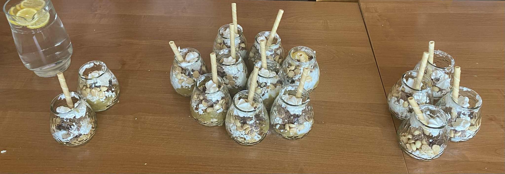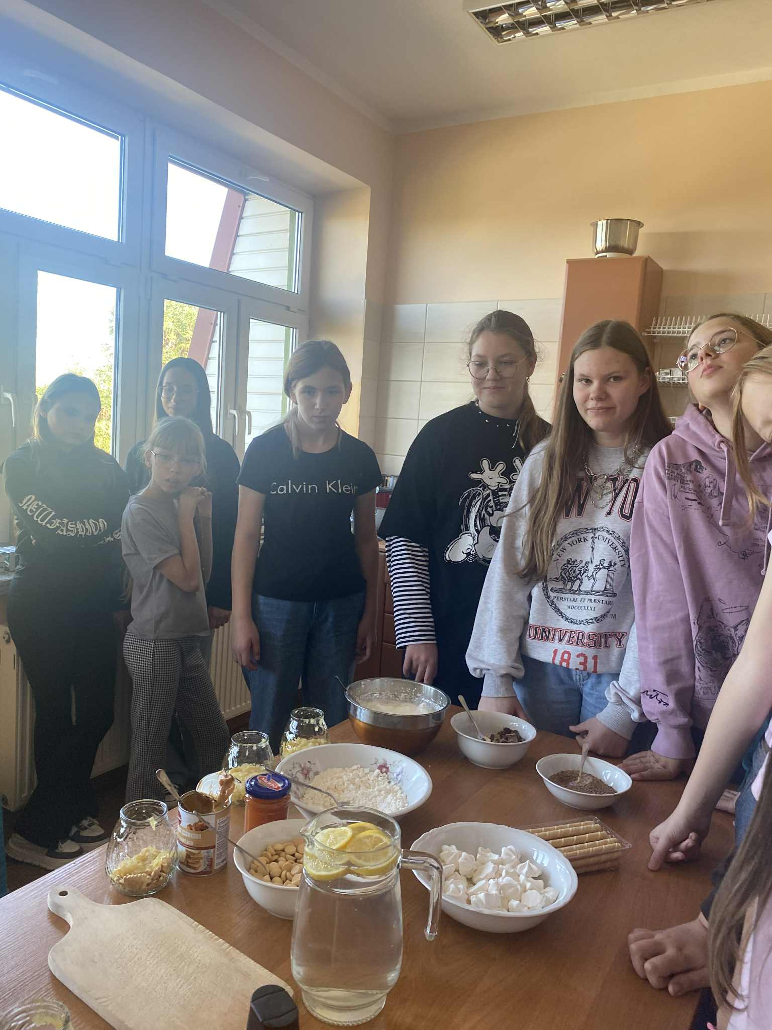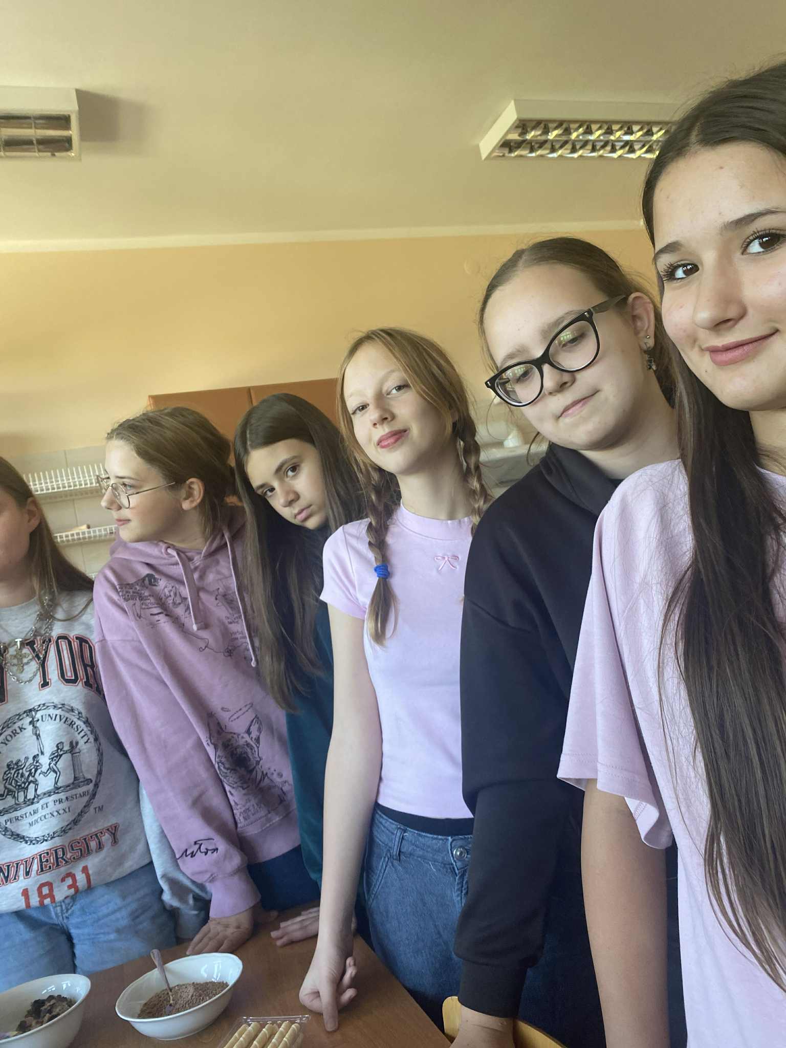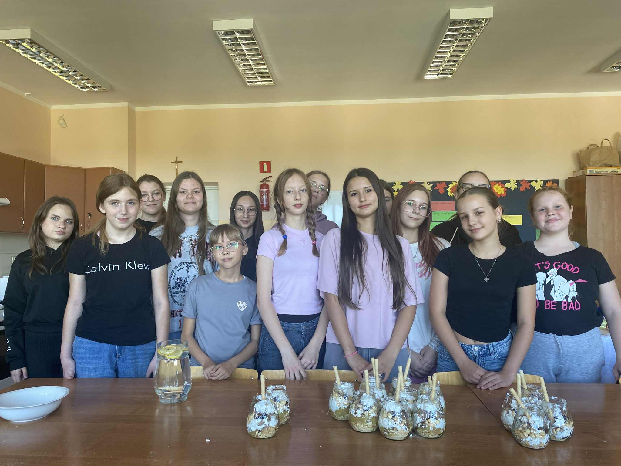 26 września 2025 r. na zajęciach Koła Miłośników Biblioteki po raz drugi obchodziliśmy Światowy Dzień Jabłka. Ten bardzo popularny owoc, bogaty w witaminy i wartości odżywcze, ma swoje święto, które jest kultywowane na całym świecie, również w naszej szkole. Celem zorganizowanego spotkania było zachęcenie uczniów do spożywania jabłek, jako źródła witamin oraz wyrabianie nawyku zdrowego odżywiania. Tego dnia nie jedno, ale wiele jabłek towarzyszyło nam podczas zajęć. Oprócz zajadania się zdrowymi, soczystymi jabłuszkami nawiązywaliśmy pozytywne relacje i świetnie się bawiliśmy. Przygotowany pyszny deser z prażonych jabłek, kajmaku, bitej śmietany, herbatników i czekolady zniknął błyskawicznie. Zajęcia minęły w „smakowitej” atmosferze i dostarczyły miłych wrażeń oraz mnóstwo witamin. Niech moc jabłek będzie z nami – przez cały jesienny i zimowy czas!