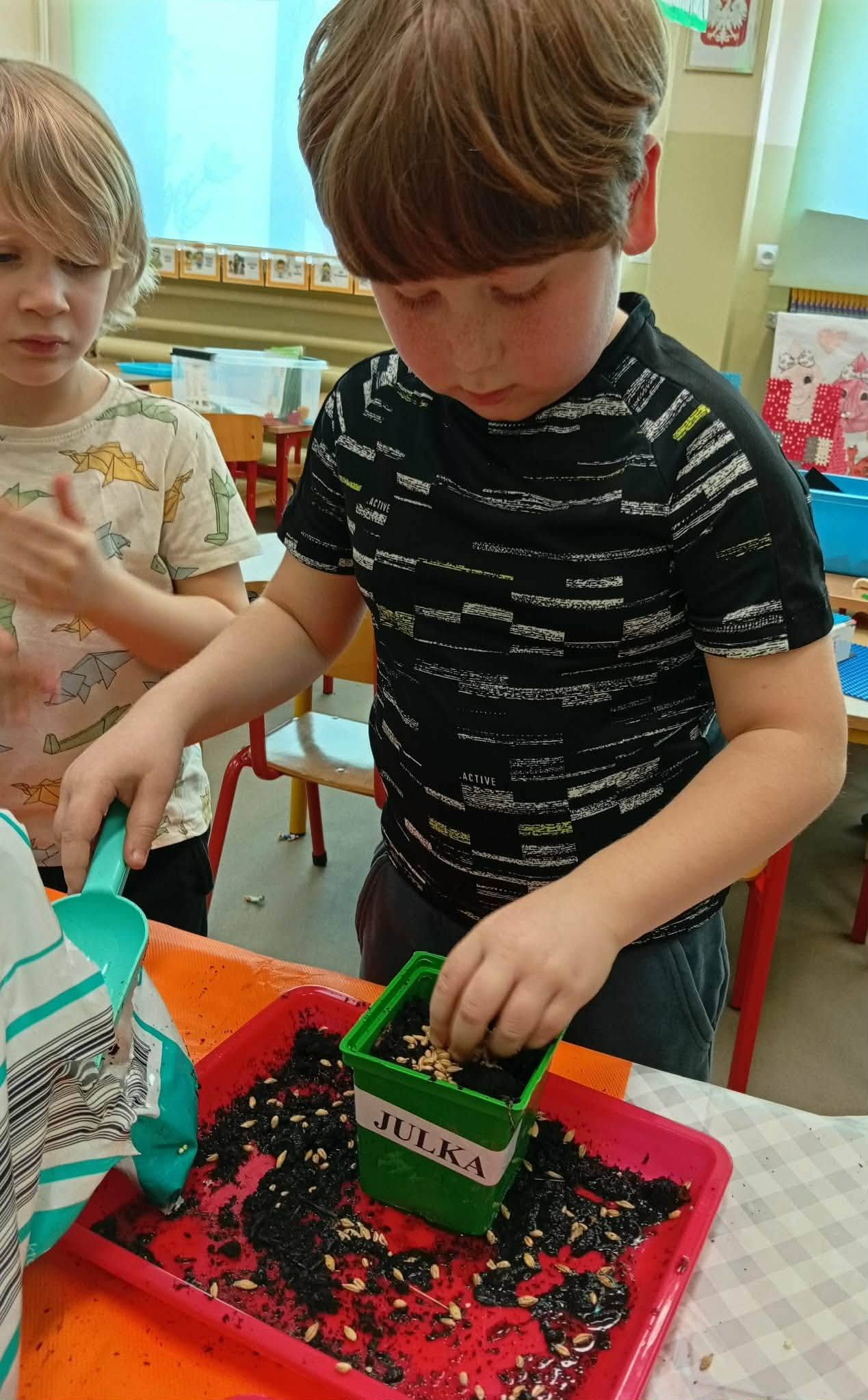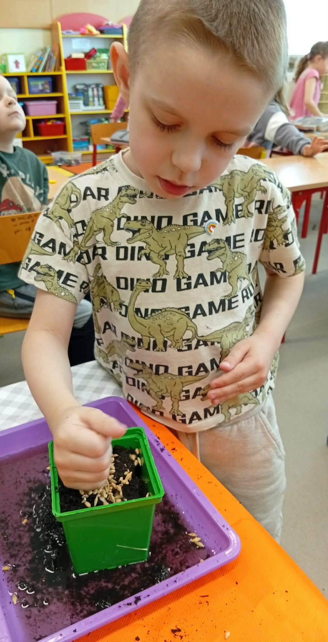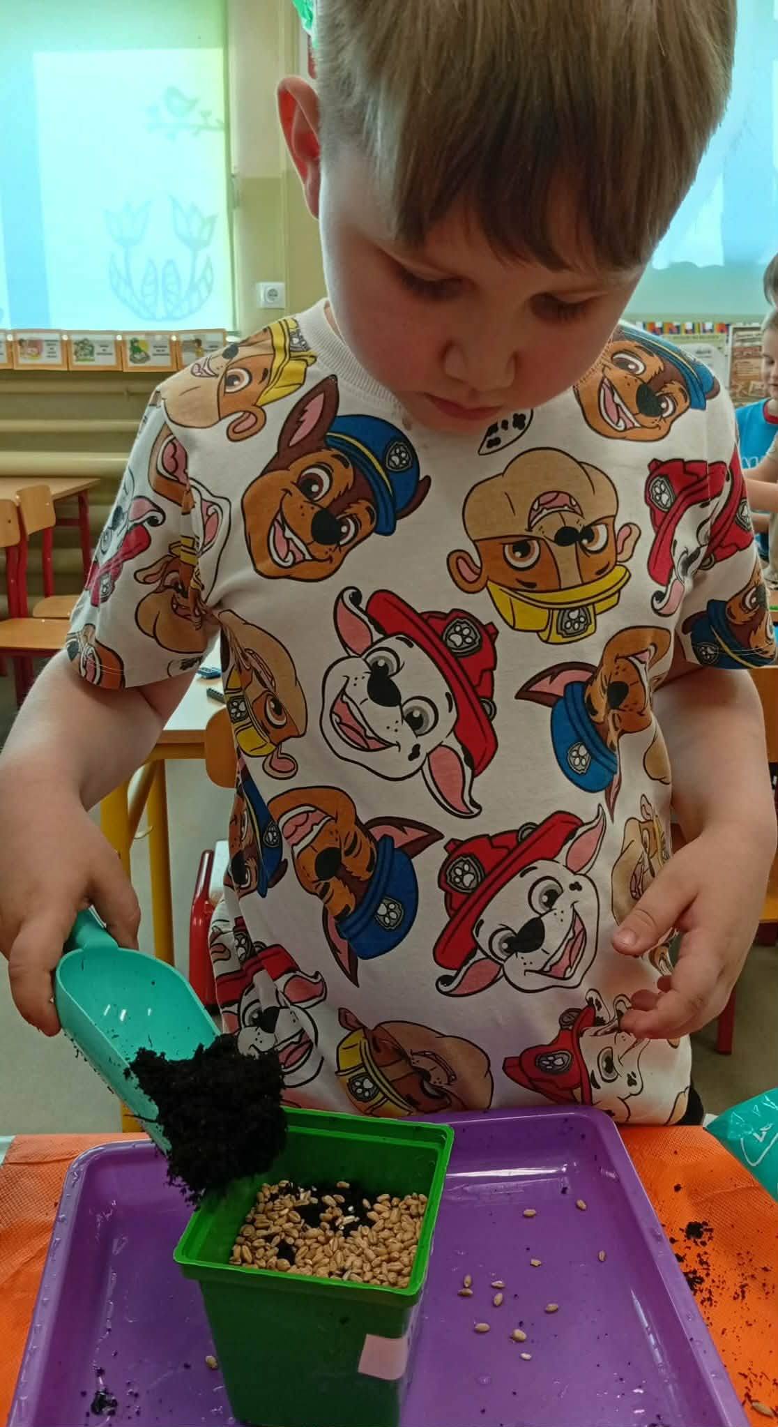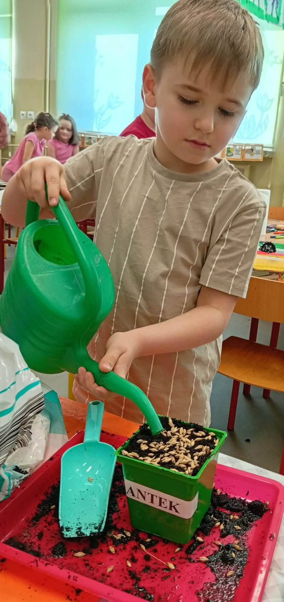 Dzieci z grupy “Liski” zakładają zielony ogródek w sali.