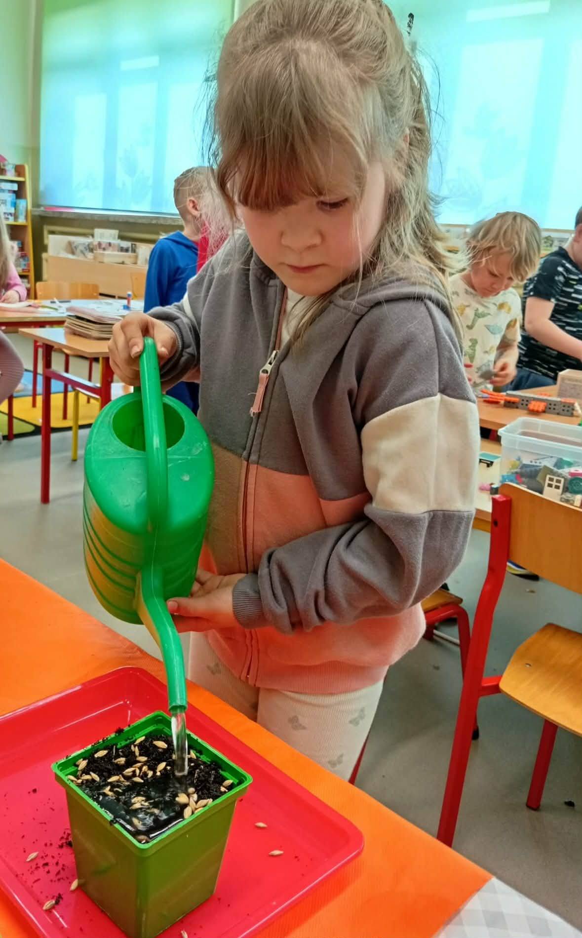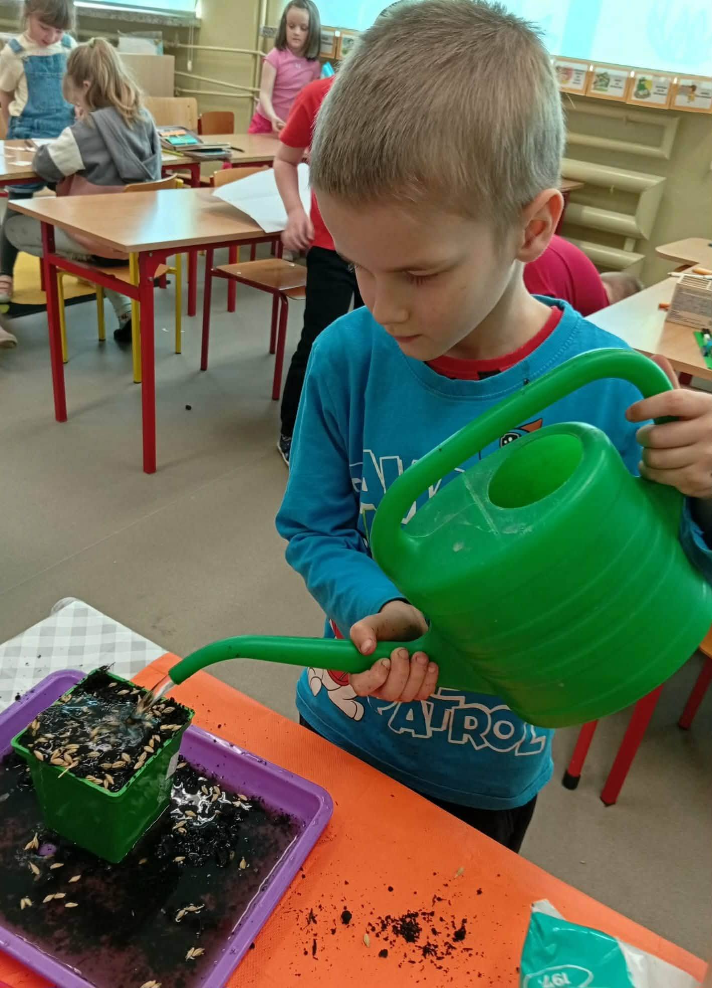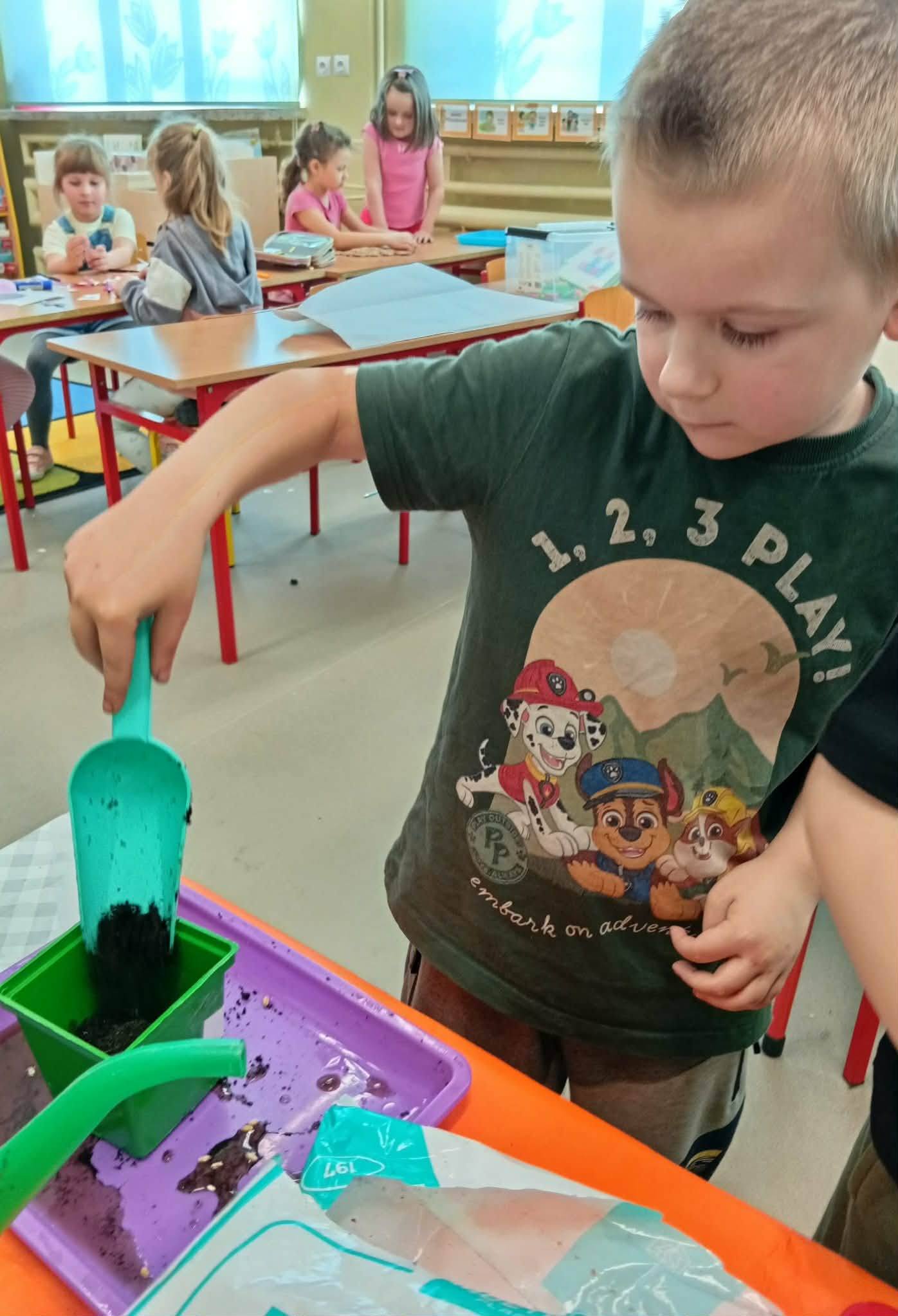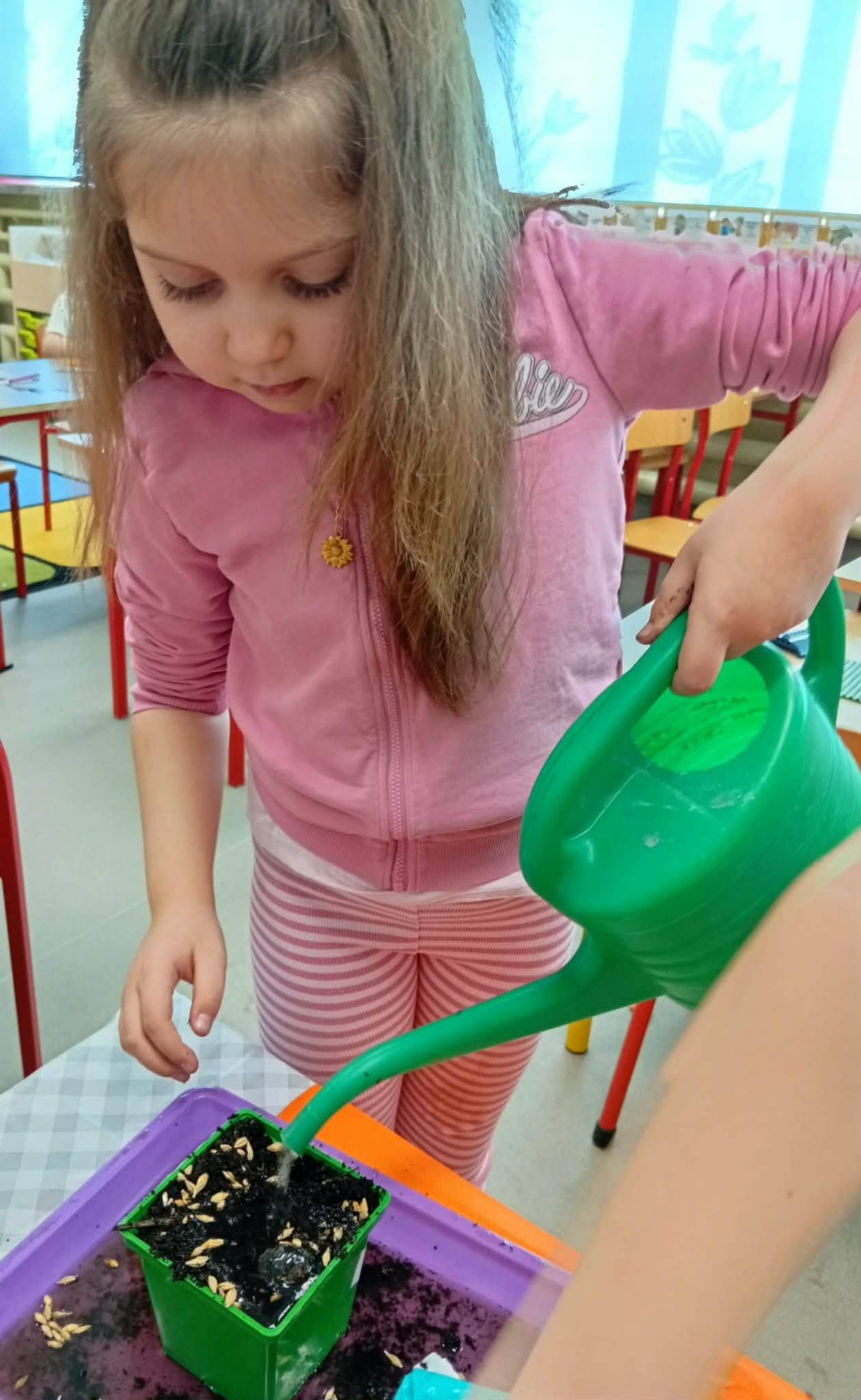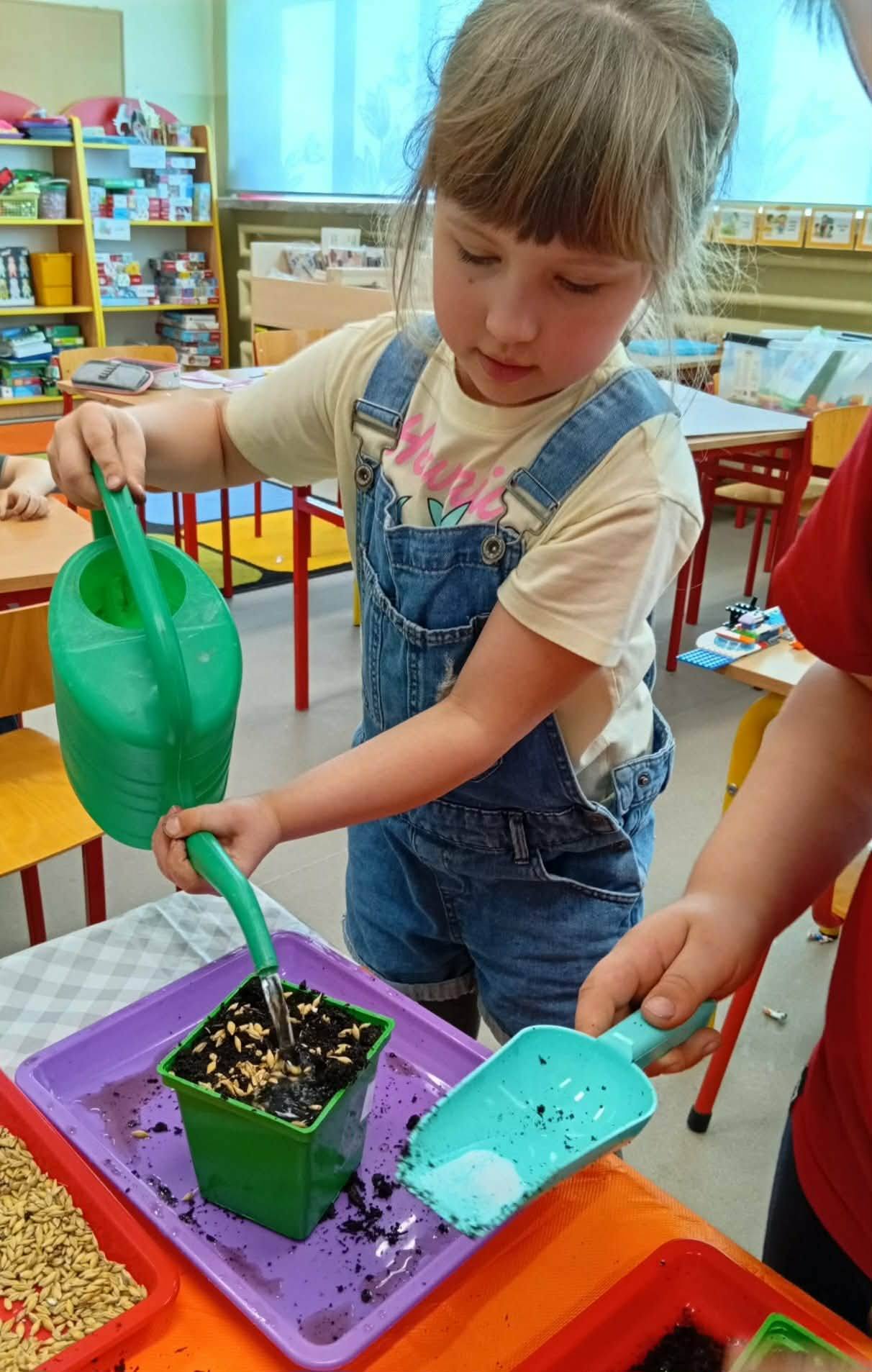 Dzieci z grupy “Liski” zakładają zielony ogródek w sali.