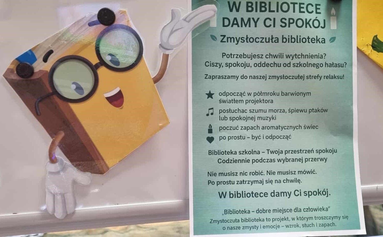 Od 1 października 2025 r. w naszej szkole ruszyła nowa inicjatywa – „Zmysłoczuła biblioteka”. To wyjątkowe miejsce, w którym podczas przerw można oderwać się od szkolnego hałasu  i zrelaksować w spokojnej, nastrojowej atmosferze.